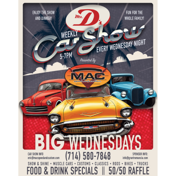 Start your engines—Big Wednesday Car Show is rolling into Mr. D’s every Wednesday night 5-7pm in Placentia! From muscle cars to lowriders, hot rods to imports, this is the place to show off your wheels and connect with fellow car lovers.